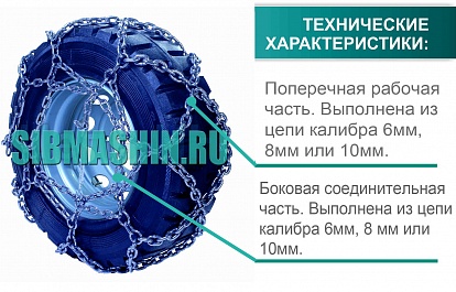 Цепи противоскольжения для погрузчиков и спецтехники тип «сота» изготавливаются из круглозвенной цепи калибрами 6/6мм, 8/8мм, 10/10мм (где первая цифра — калибр поперечной рабочей части цепи, вторая цифра — калибр боковой соединительной части цепи).