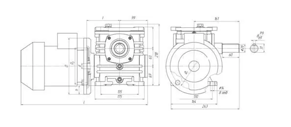 • 3. двигатель горизонтальный, тихоходный вал вертикальный, справа от двигателя;