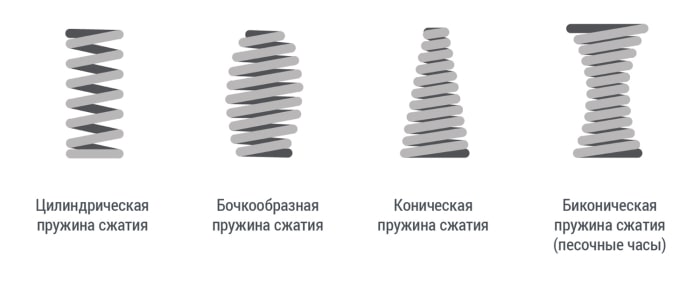 Пружина сжатия пожалуй самый распространённый вид пружин. Название говорит само за себя, пружина должна сжиматься когда на неё воздействует внешняя сила. Говоря сухими терминами пружина сжатия это упругий элемент рассчитанный на уменьшение длины по действием нагрузки и возвращающийся в исходное состояние когда нагрузка исчезает. Витки пружины сжатия имеют между собой расстояние, которое уменьшается когда на пружину начинает воздействовать сила.
